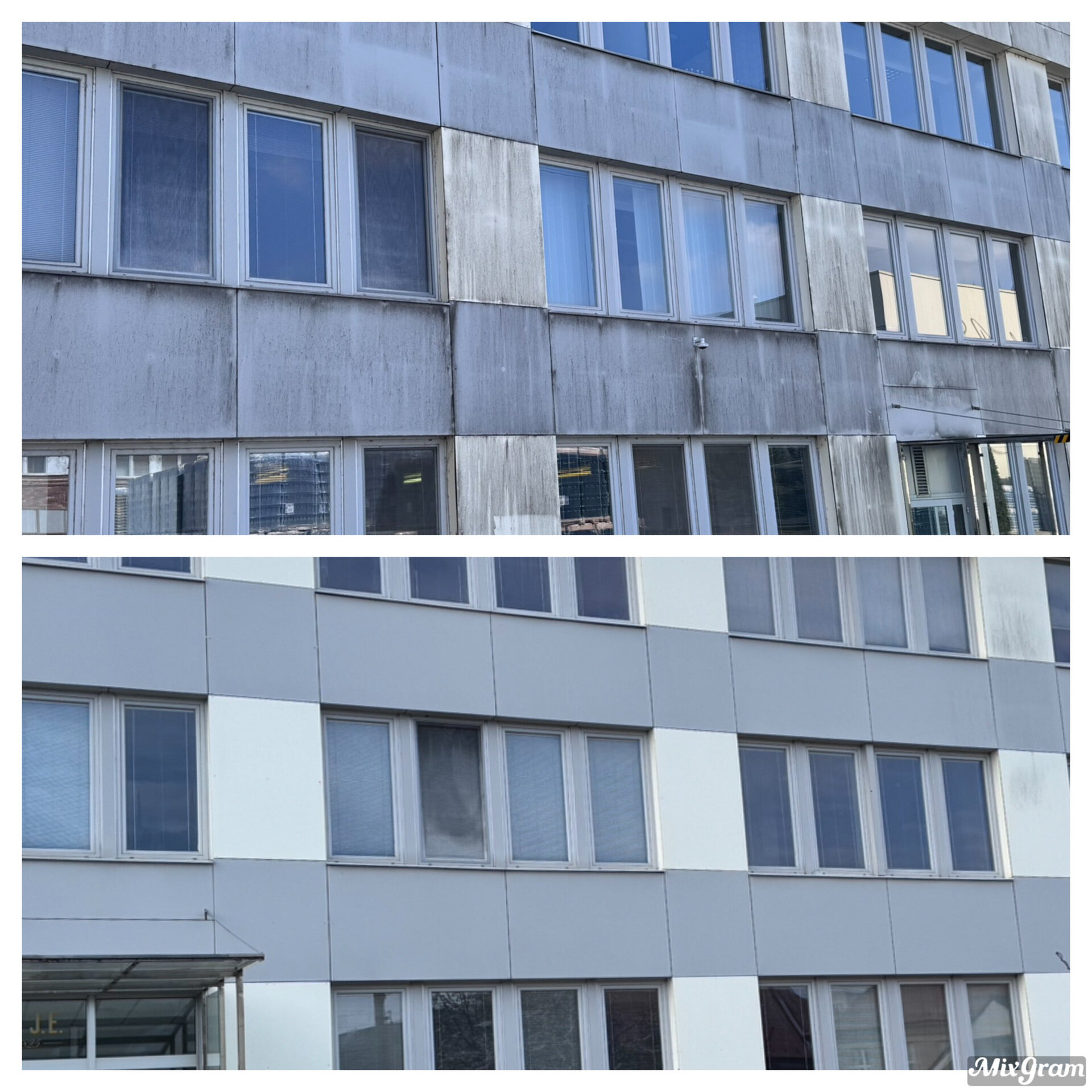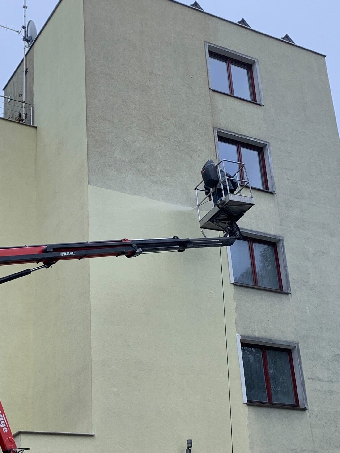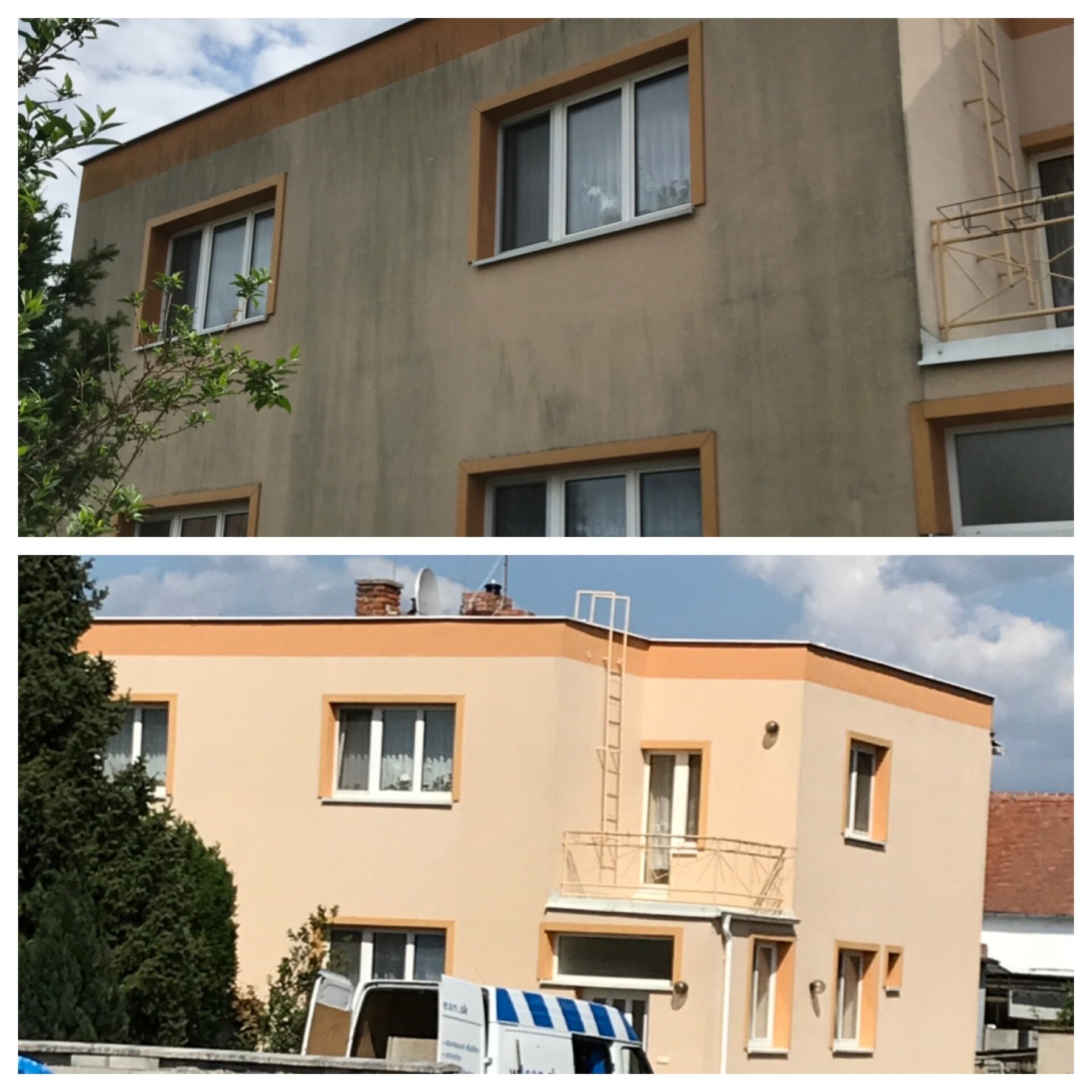 Akékoľvek silne znečistené fasády odborne zbavíme povlaku zo smogu a prachu, usadenín z komínov, sadzí alebo výparov z kuchyne. Zbavíme dom mikroorganizmov, zelený povlak z rias a plesne očistíme šetrne bez poškodenia fasády. Na záver nanesieme fungicídny nástrek.